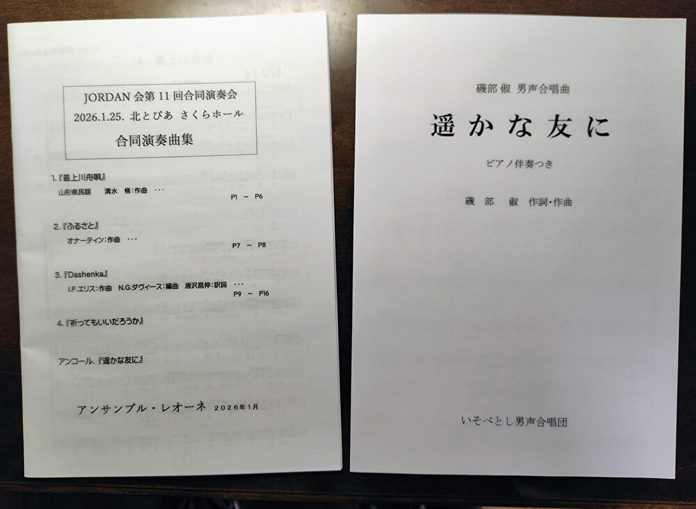 練習時間前に、「JORDAN会合同演奏曲集(最上川舟歌、ふるさと、祈ってもいいだろうか)」