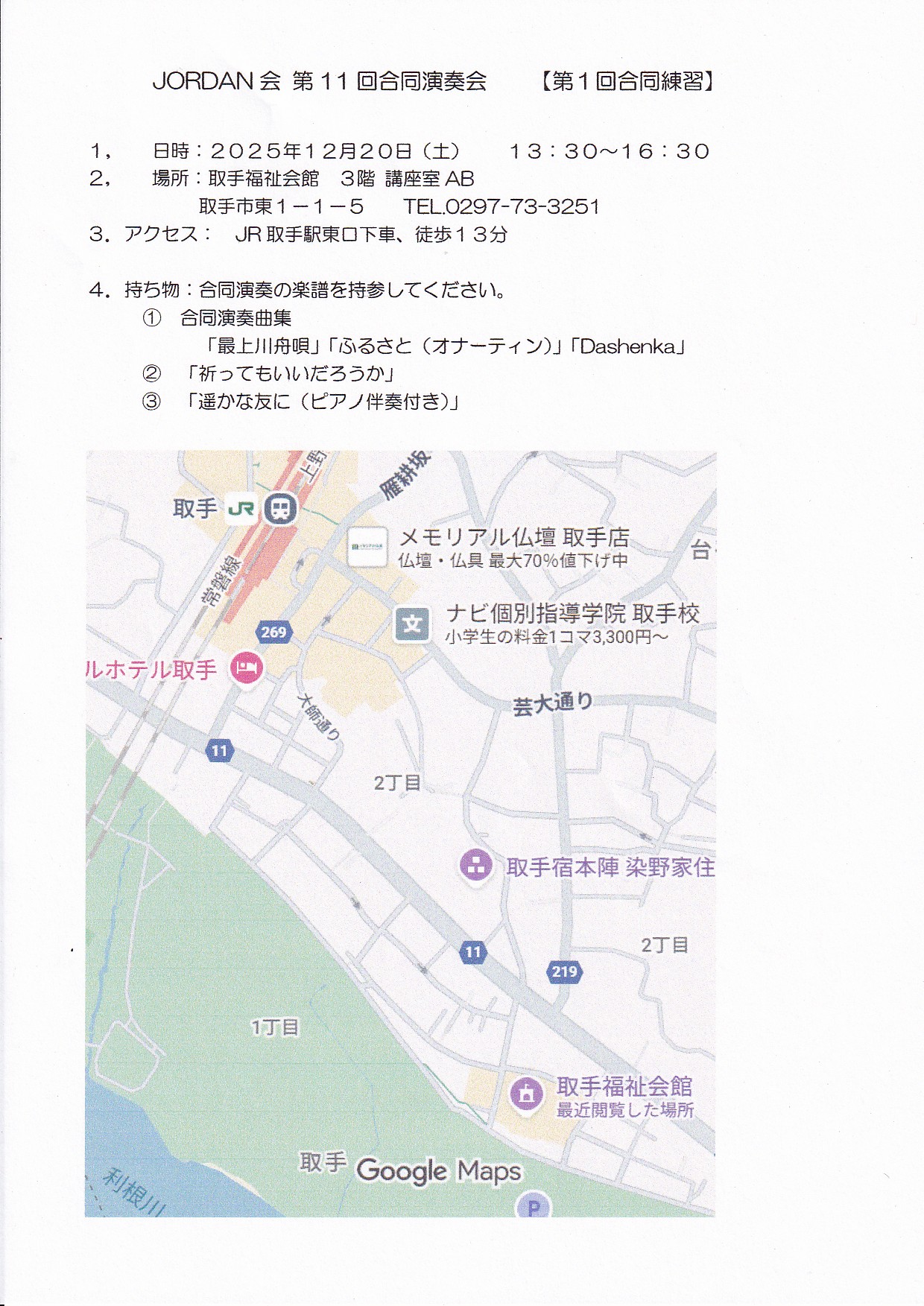 12/20(土)13:30~16:30 取手福祉会館で、第1回JORDAN会合同練習があります。